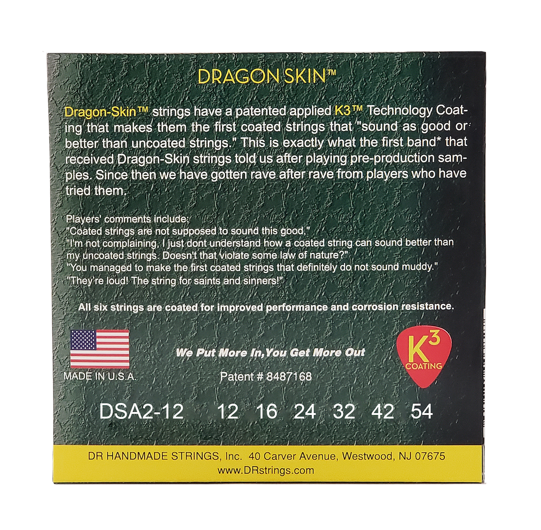 Struny na akustickou kytaru DRAGON SKIN™ jsou vybaveny průhledným potahem na vinutí z fosfor broznu, který zamezuje tomu, aby se špína a pot dostaly k hexagonálnímu jádru a tím zapříčinily jeho korozi. Potah, který je aplikován na všech strunách v sadě, je ultra tvrdý a netlumí vibrace tak, jak to dělají měkčí potahy. Struny mají lepší projekci, méně nevítaných harmonických, větší jasnost a artikulaci než nepotažené struny.