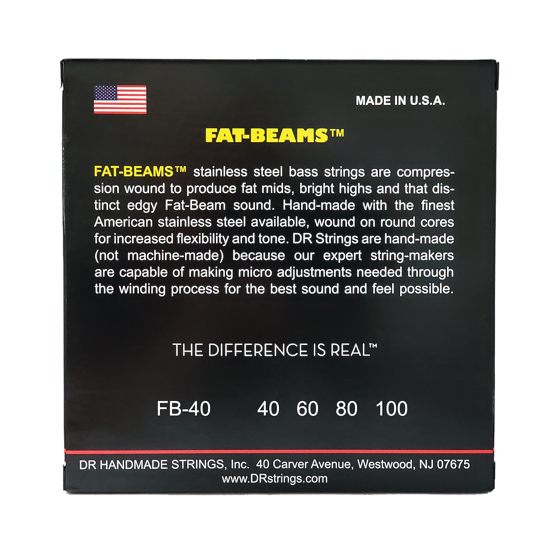 Basové struny FAT-BEAMS™ kombinují vinutí z nejlepší americké nerezové oceli a kulaté jádro, ale jsou vyráběny pomalejším procesem vinutí s vysokou kompresí, aby se dosáhlo výraznějších středů, jasných výšek a supertlustých spodků. Když je potřeba, produkují obecně plnější zvuk s pevným průrazem.