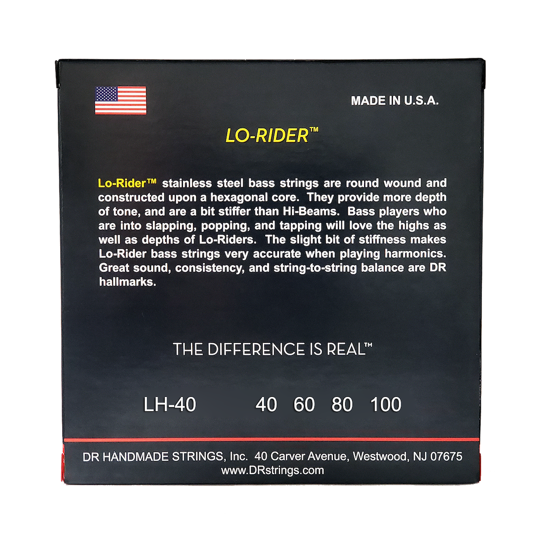 Basisté, kteří milují slap, vytrhávání a tapping, si zamilují výšky a basy strun Lo-Rider. Lehká tuhost basových strun Lo-Rider pomáhá konkrétnosti, když hrajete flažolety. Skvělá konzistence a výborná vyváženost strun jsou základními znaky DR. Struny Lo-Rider poskytují větší hloubku tónu a jsou o něco tužší než Hi-Beams.