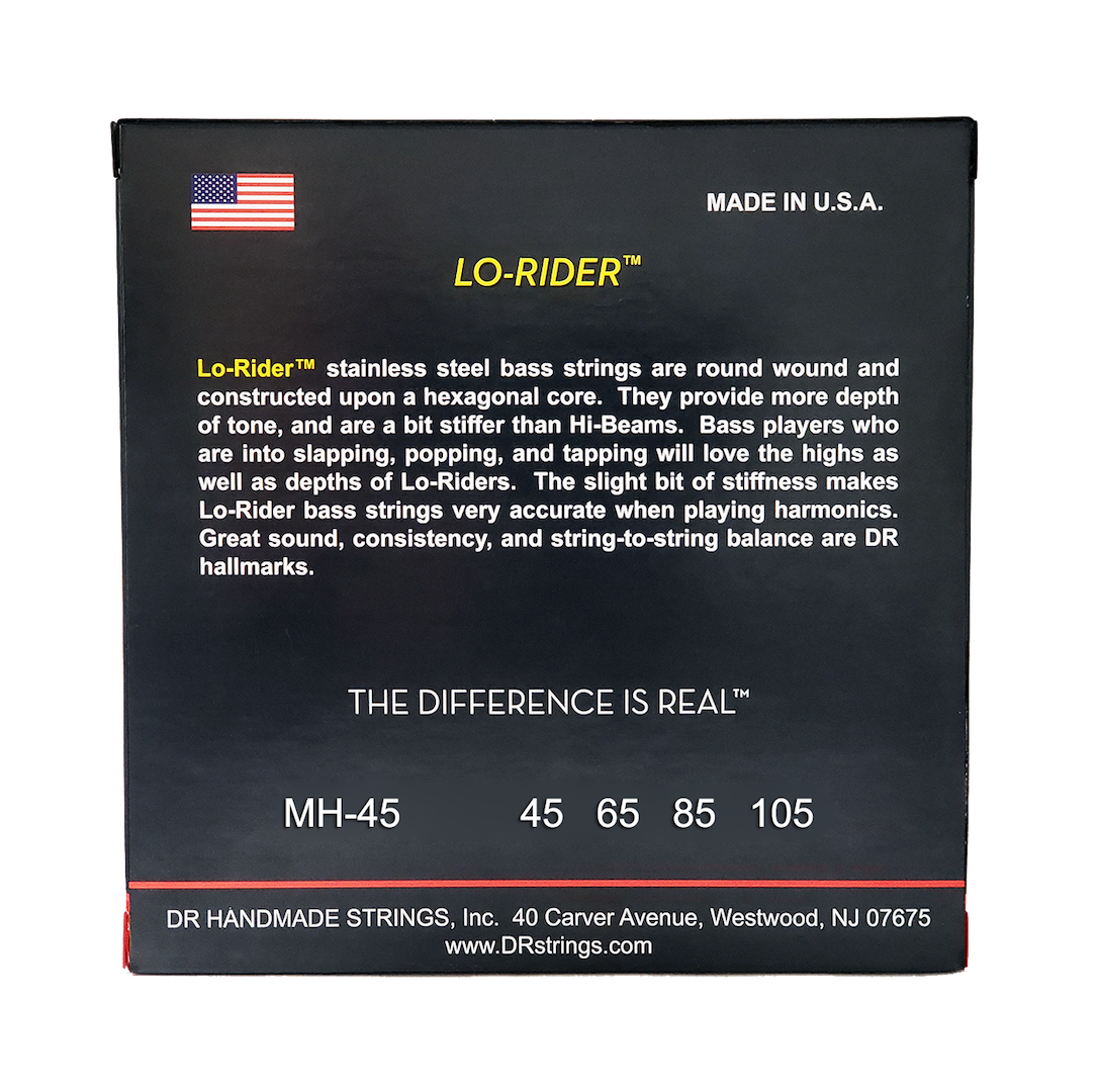 Basisté, kteří milují slap, vytrhávání a tapping, si zamilují výšky a basy strun Lo-Rider. Lehká tuhost basových strun Lo-Rider pomáhá konkrétnosti, když hrajete flažolety. Skvělá konzistence a výborná vyváženost strun jsou základními znaky DR. Struny Lo-Rider poskytují větší hloubku tónu a jsou o něco tužší než Hi-Beams.