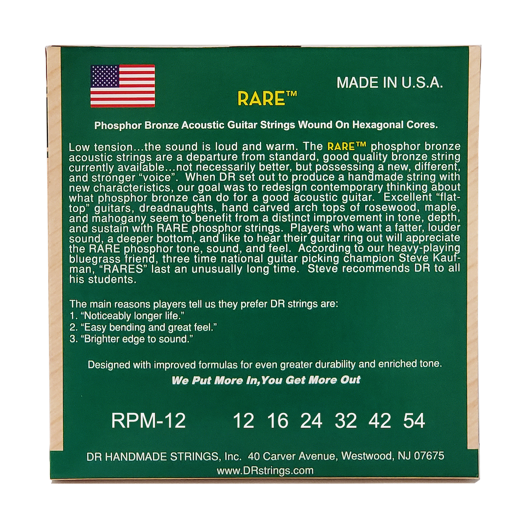 Nízké pnutí… zvuk je hlasitý a vřelý. Fosfor bronzové struny na akustickou kytaru Rare jsou jistým odklonem od standardních a kvalitních bronzových strun na trhu… ne nutně lepší, ale mají nový, jiný a silnější „hlas“. Když se DR rozhodnou vyrobit strunu s novou charakteristikou, je naším cílem změnit současné přesvědčení o tom, jak může fosfor bronzová struna prospět dobré akustické kytaře. Zdá se, že ručně vyráběné semiakustické kytary, dreadnaughty a dobré akustické kytary vyrobené z palisandru, javoru a mahagonu profitují ze znatelného zlepšení tónu, hloubky a vřelosti fosforových strun Rare. Hráči, kteří chtějí tlustější a hlasitější zvuk, a také hlubší basy (kteří chtějí slyšet své kytary zvonit), ocení u strun Rare jejich tón, zvuk a pocit.