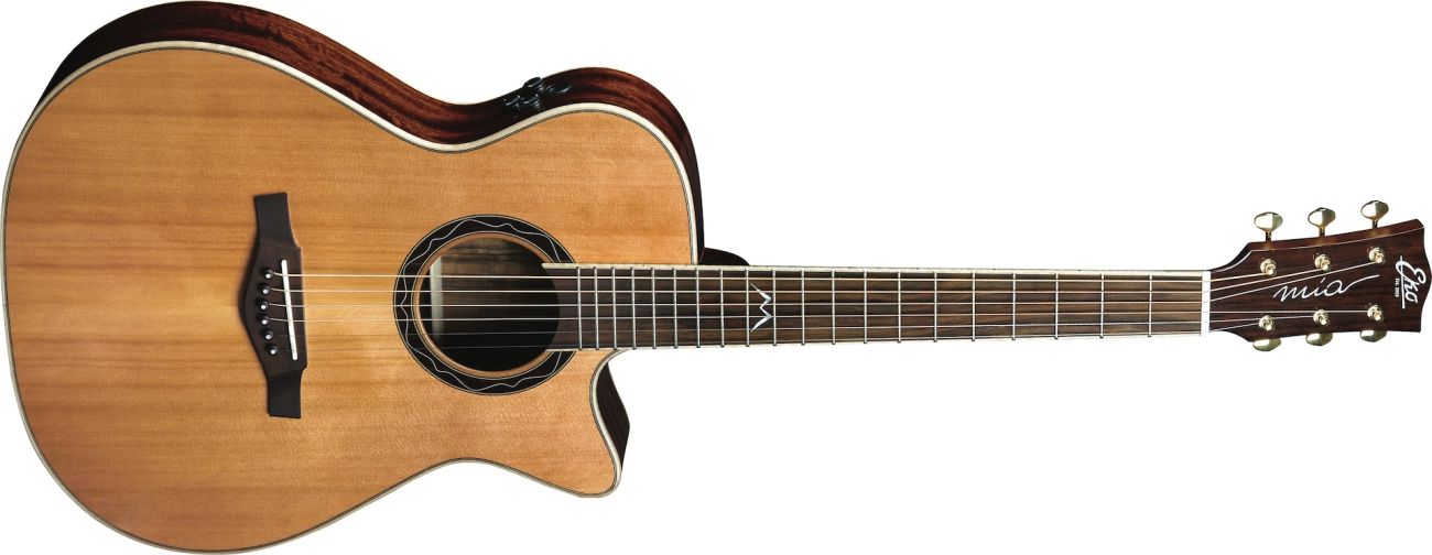 The MIA A400ce is the electrified acoustic guitar by Eko Guitars, with onboard Fishman Flex Blend system. Featuring an Auditorium cutaway shape with Solid Cedar Top, 3-ply laminated Ovangkol back and sides, Okoume neck and Rosewood fingerboard, this guitar is well suited for both live performances and studio recording.