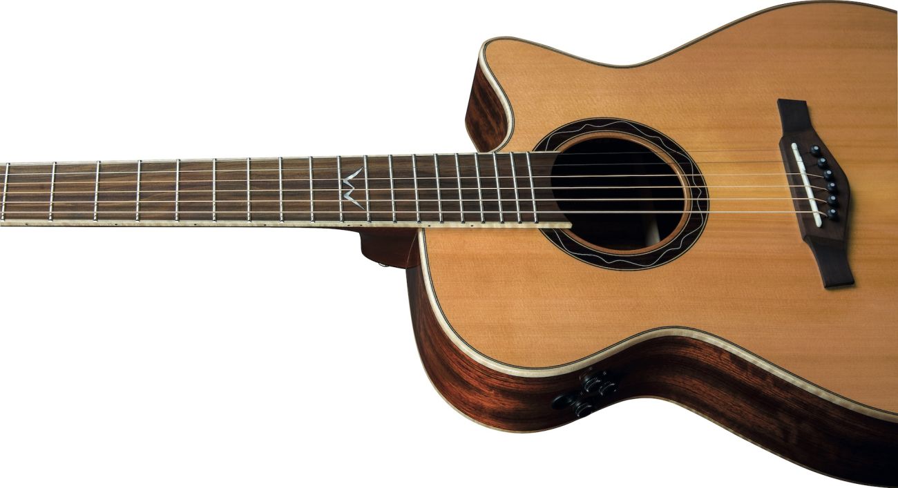 The MIA A400ce comes in Natural color with Gloss finish and an Auditorium cutaway shape, a feature that allows the guitarist to easily reach the higher frets. The combination of a Solid Cedar top with Ovangkol back and sides, result of careful research, gives this instrument a wide and always well-balanced tonal spectrum on every single string. A remarkable feature is the presence of the Fishman Flex Blend: a high-performance amplification system consisting of a piezo and an internal condenser microphone, allowing you to capture every nuance of the guitar thanks to the possibility of gradually adding the microphone signal to the piezo signal through a Blend pot. In addition to the output volume and the Blend control, the MIA A400ce boasts a Tuner with display, (that can be activated by pressing the volume potentiometer) and an EQ control working in "mid-scooped" mode: set it at minimum for a flat signal, then increase it to gradually reduce the mid frequencies in favor of bass and treble, very convenient to achieve a ready-for-the-mix sound. In case of feedback, a quite common event during acoustic performances, you can invert the phase by pressing the EQ pot. All these features together make the MIA A400ce a suitable instrument in professional contexts, both in the recording studio and on stage.