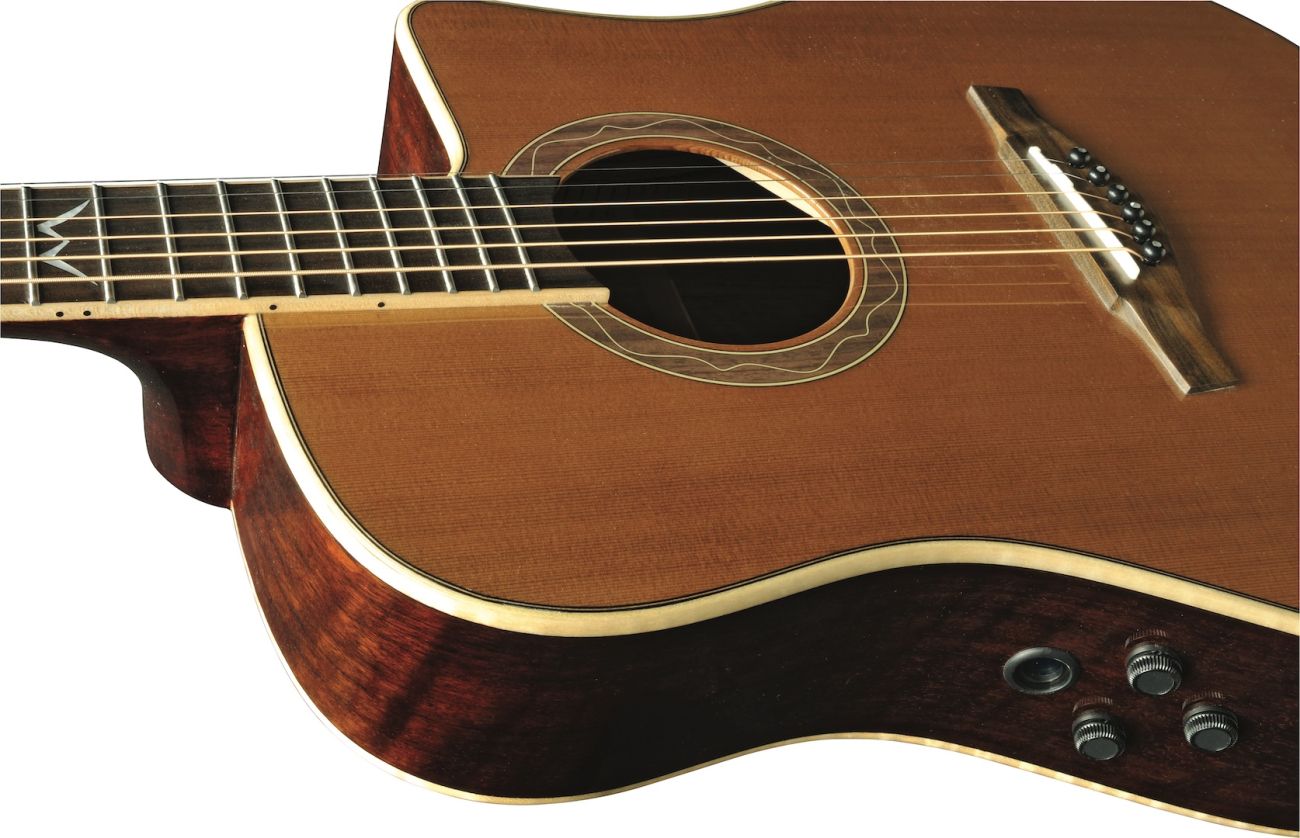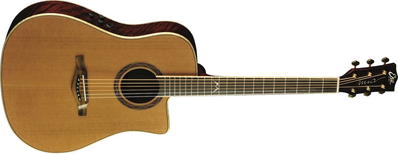 The MIA D400ce is the electrified acoustic guitar by Eko Guitars, with onboard Fishman Flex Blend system. Featuring a D cutaway shape with Solid Cedar Top, 3-ply laminated Ovangkol back and sides, Okoume neck and Rosewood fingerboard, this guitar is well suited for both live performances and studio recording.