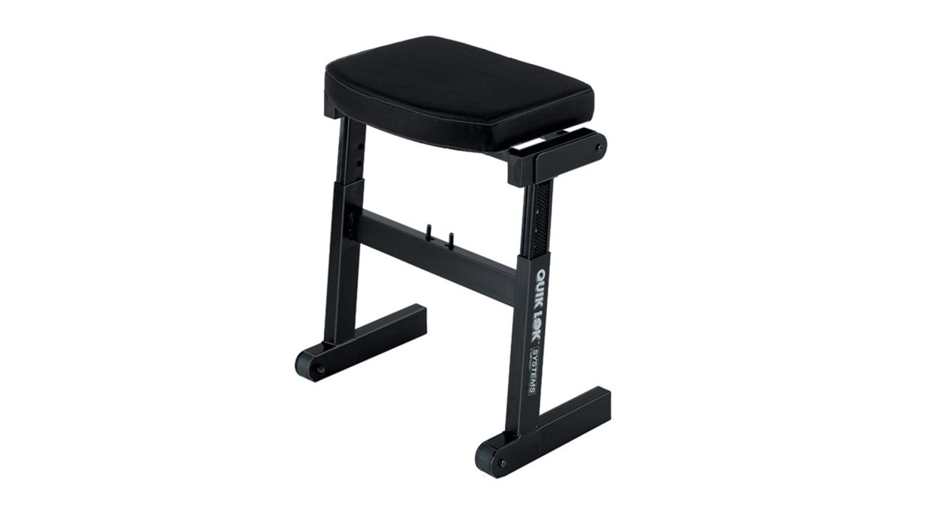 Rychle sestavitelné sedadlo pro hudebníky s tlustým, extra širokým sedákem s texturovaným potahem.