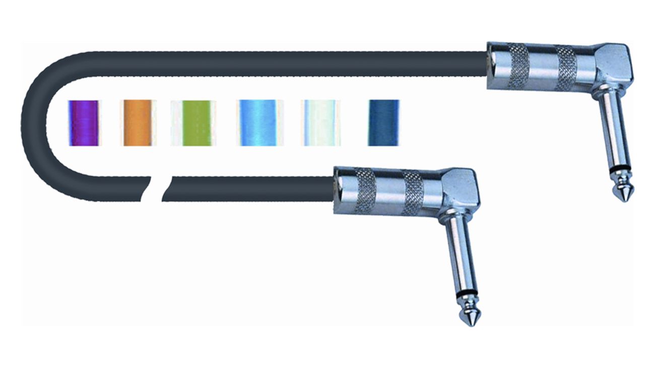 Efektový propojovací kabel s Mono 6.3 mm lomenými kovovými jacky a kabelem základní série délky 0,2 m. Šest různých barev.