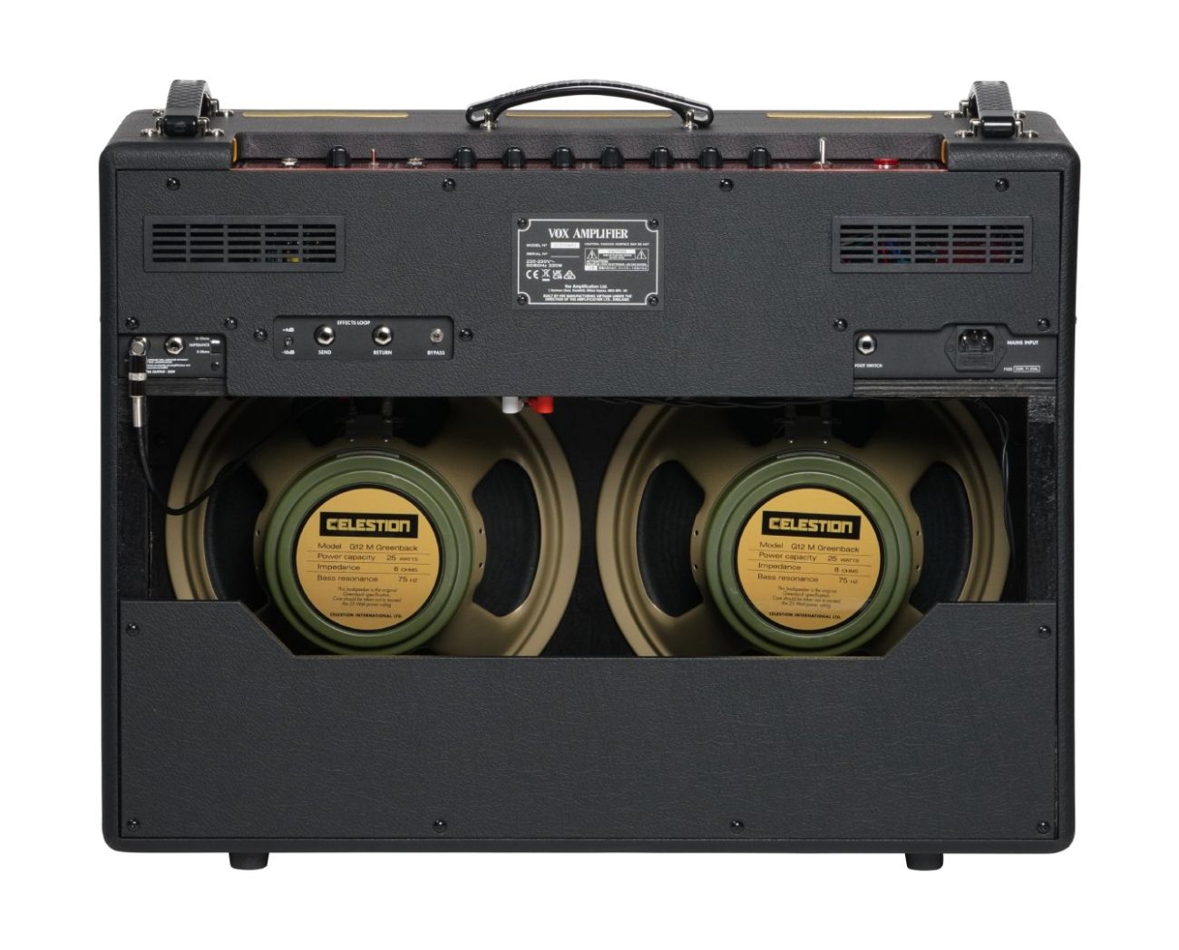 Se dvěma 12" reproduktory Celestion G12M Greenback uvnitř je zvuk nezaměnitelně VOX, ale s mírně ostřejším charakterem. Greenbacky přinášejí kulatější výšky, jemnější důraz a rychlejší náběh zkreslení reproduktoru. Pokud je Alnico Blue jiskrný a průzračný, Greenback je celý vřelý a zrnitý.
